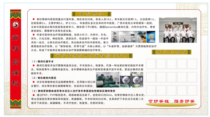 外脊柱骨病科是医院重点打造科室,病区床位35张,医务人员16人,其中副主任医师1人,主治医师1人,住院医师2人,主管护师2人,护士12人。 科室团队多次在深圳市中医院、广西中医药大学附属第一医院、玉林中西医结合骨科医院等进修学习。拥有西门子C臂机、德国Spinendos椎间孔镜、内热针治疗仪、骨密度检测仪、腰椎牵引床等先进设备。科室中医特色治疗颈肩腰腿痛。包括小针刀、内热针、针灸、浮针、穴位注射、神经阻滞、烫熨治疗,形成保守→微创→开放手术的一站式、立体化的治疗模式。突出临床诊疗的中医特色,着力提高临床治疗效果。以“瘀阻脉络、肝肾亏虚”为核心病机,...