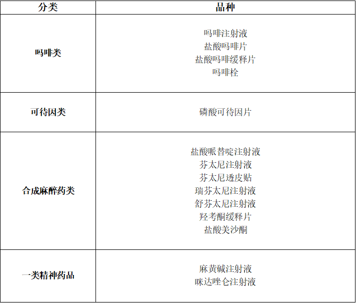 麻醉药品包括:吗啡类、可待因类、大麻类、合成麻醉药类及其他易成瘾癖的药品、药用原植物及其制剂。医院常见的麻醉药品有以下几种: