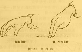 小儿推拿常用手法有其一定的特点,现主要介绍如下: 【推法】 推法在小儿推拿临床应用相当广泛。有直推法、分推法、合推法和旋推法四种。 1.直推法(图196)医生用拇指桡侧缘,或用食、中两指指面附着于治疗部,做单方向的直线推动 动作要轻快连续,一拂而过,如帚佛尘状,以推后皮肤不红为佳。手法频率每分钟约250~300次。 推动时必须行直线,不可歪斜,以恐动别经而招患。 常用于推拿特定穴中的“线状穴位”和“...