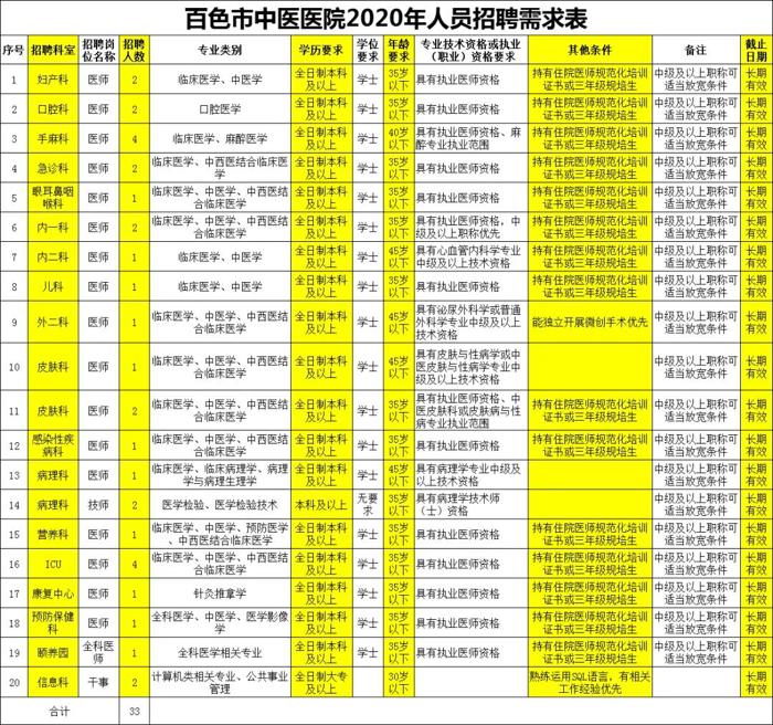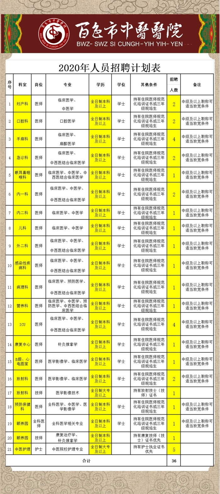 2019-03-22因医院业务工作需要,现面向社会,诚招聘用制工作人员:序号科室需求计划其他条件岗位学历人数专业1宣传科干事本科或以上2新闻、公共事业管理有新闻宣传工作经验者优先2外科医师本科或以上2临床医学(骨科、胸外科方向)取得执业证,中级以上职称优先,25周岁以上、40...