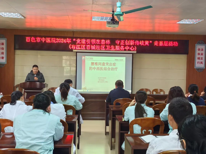 座谈会后,黎昇副书记对百城社区卫生院中医馆建设等工作进行指导,脊柱骨病科主任主伟将开展《腰椎间盘突出症的中西医治疗》专题讲座,壮医学科主任陈鹏进行壮医适宜技术“水蛭疗法”培训,心肺科护士长梁姜玉进行中医适宜技术“墨玉罐疗法”培训,推拿科主任梁雪娇进行教学查房,开展疑难病例讨论,现场学习气氛高涨。