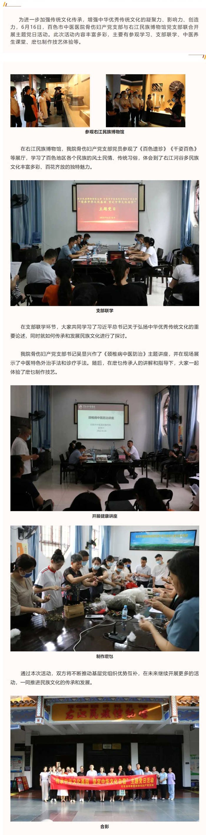 为了进一步增强基层党支部组织活力,推动“五基三化”攻坚年行动,9月29日,威尼斯vns08866行政第二党支部、骨伤妇产党支部联合百色市公安局交通警察支队第五党支部、第七党支部开展主题党日活动,主题党日活动分为理论课堂和现场体验两部分。活动由威尼斯vns08866行政第二党支部书记韦泉辛主持。活动现场廖彬雅警官开展交通安全知识讲座现场互动活动首先由威尼斯vns08866骨伤妇产党支部书记吴显兴、...